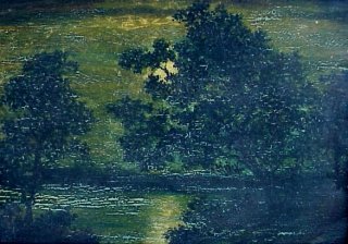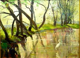 RODOWICZ, L., (European, 20th C.): Beautiful orange sunset through a stand of birch trees overlooking a lily pond, SLR, 11" x 14". |