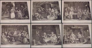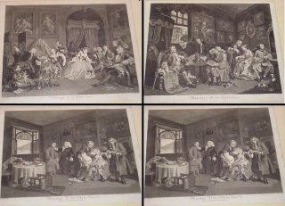 4 PIECE SHRINK WRAPPED PRINT LOT: Depicting scenes such as "The Green Room of the Opera" a hand colored print, "Country Inn Yard" reproduction print from Marriage ala Mode by Hogarth, and Champs Elysees. |