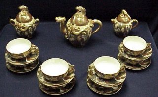 JAPANESE PORCELAIN TEA SET: Sukagawa, decorated in gold and silver tree motif. Set includes pot and four cups with covers. |