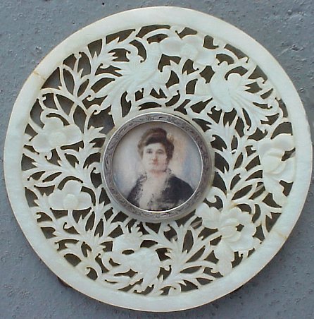 | 2A | EARLY 20TH C W/C ON IVORY, PORTRAIT OF A WOMAN: 1 1/2"dia., no visible signature, encased in incised sterling frame with carved jade-like, Asian motif circular surround (please note repair to surround), marked verso G.T. Marsh & Co. Sterling. |