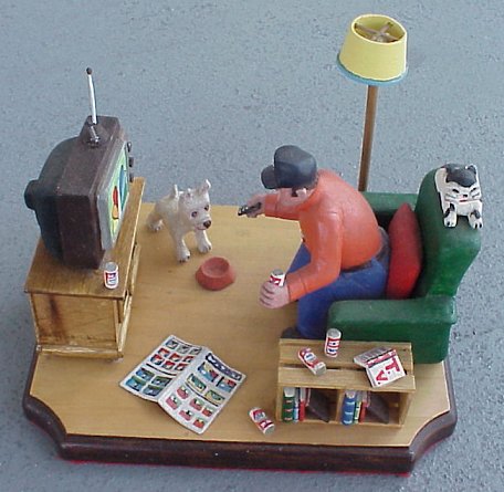 | 10 | HAND CARVED AMERICAN FOLK ART DIORAMA: Depicts a Yankee fan watching the ball game from the comfort of his living room, 8" x 10" x 8", no visible signature. |