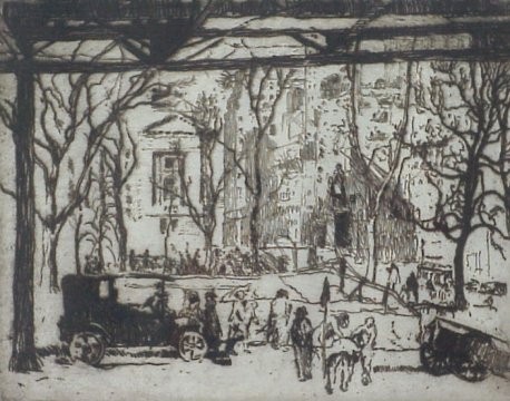 | 24A | BARONE, Antonio, (American, 1889-1979): "Bryant Park", back of the New York public library under the 6th Ave "L", Dry Point Etching, 6 3/4" x 8 3/4", SLL in pencil, dated 1915. Est. $200/400** |