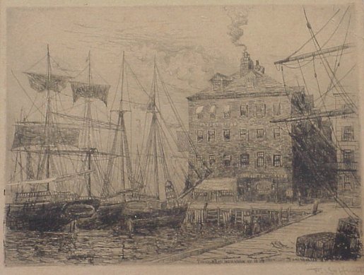 | 24B | HUNTER, Frederick Leo, (American, 1858-1943): "The Old India Wharf, New York, 1879", dry point etching, sight size 9 1/2" x 12 1/2", pencil SLR, copyright dated 1927. |