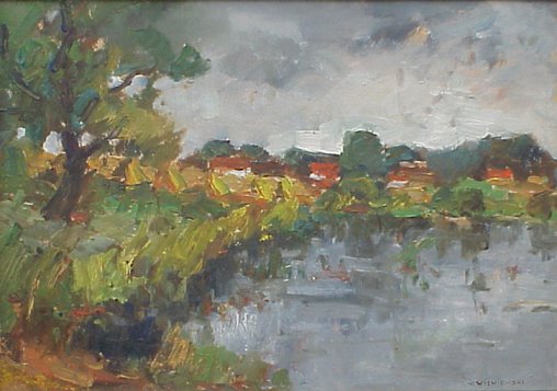 | 44 | WISNIEWSKI, Witold, (Polish, 20th C): Riverside landscape, O/B, 13" x 19", SLR, Lower Ends Rhoads Gallery label affixed verso. |