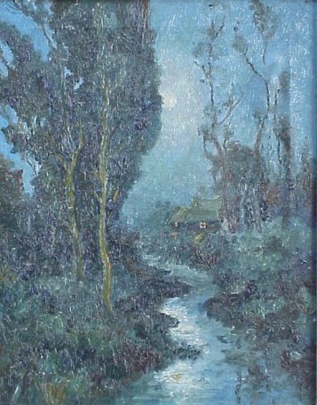 | 69A | AMERICAN? IMPRESSIONIST NOCTURNAL MOONLIT WILDERNESS LANDSCAPE WITH CABIN BY A CREEK: 18 1/2" x 14 1/2", no visible signature. Call for condition. |