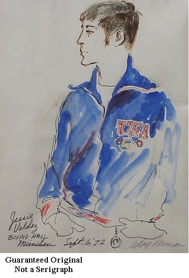 | 93A | NEIMAN, Leroy, (American, 20th C.): "Jessie Valdez, Boxing Hall Munchen", mixed media, signed lower right in pencil, titled lower left, dated Sept. 6, '72, in middle, sight size 15" x 11 3/4", professionally framed and matted. Est. $2800/4000** |