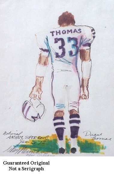 | 93B | NEIMAN, Leroy, (American, 20th C.): "Duane Thomas, National Anthem, Super Bowl, '72", mixed media, signed lower left in pencil, titled and dated Jan 16 '72, sight size 15" x 11 1/2", Merrill Chase label affixed verso with artist biography. Professionally framed and matted. Est. $3000/5000** |
