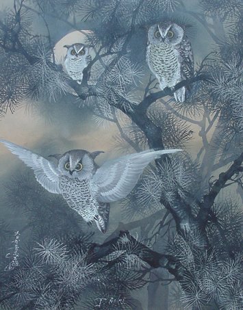 | 96 | AOKI, T.,(American, 20th C.): Owls in Fir, gouache, 26 1/2" x 21 1/2", signed. Est. $800/1200** |