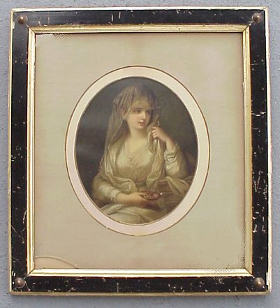 | 96A | 19TH C CHROMOLITHOGRAPH, "VIRGIN OF LIGHT": After Swiss master Angelica Kaufmann, oval 11" x 9", encased in period ebonized gilt Victorian frame. |