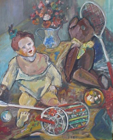 | 117 | STERNER, H., (American, 20th C): Still Life of toys and flowers in a vase, O/C, 28 3/4" x 32 3/4", SLR. |