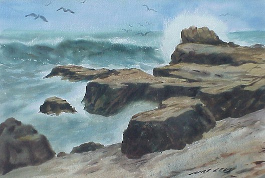 | 121A | LEVY, Nat, (American, 1896-1984): Costal Scene with birds and water crashing, W/C, 14" x 21", SLR. Est. $600/800** |