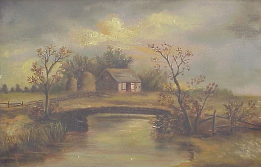 | 155 | PRIMITIVE AMERICAN O/B COUNTRY LANDSCAPE WITH HOUSE: 12" x 18 1/2", no visible signature. |