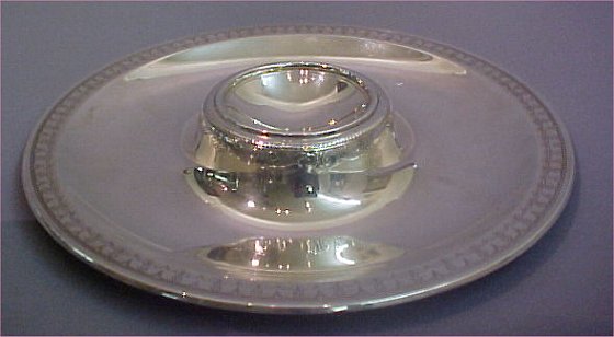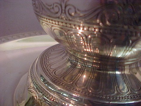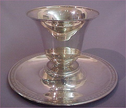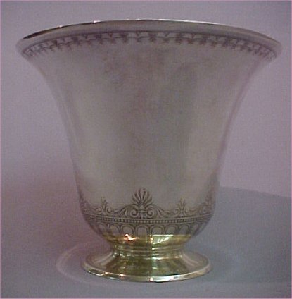 Lot 51) TIFFANY & CO. STERLING CENTERPIECE, CA. 1907-1947: Large 2 part flared vase and undertray with Art Deco chased design. Marked "Tiffany & Co./ Makers/ Sterling Silver/ 925-1000 M. Overall height is 8", vase measures 6 1/2"h, 7 3/4" dia. Tray is 13" dia. Approx. 47.93 oz