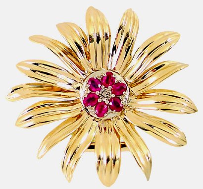 1.5CT BURMESE RUBY & DIAMOND BROOCH: This stunning estate brooch features 6 Burmese rubies clustered in the center of an expansive flower blossom accented with a diamond in the center. The stones are hot bright and full of fire and color. This heavy antique brooch is expertly crafted with a double hinged locking pinback to both support the weight and protect the treasure. Retail Value $2500.00