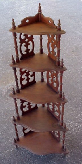 VICTORIAN CORNER ETAGERE: Different than most. Warm walnut with pierced carved back and spool turned spindle supports. 5 tiers in graduating depth. 58"h. | 150 |