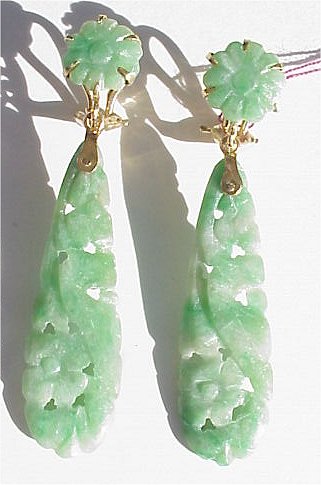 LOVELY PIERCED & CARVED SNOW JADE EARRINGS: Nicely conceived in a floral motif to dangles with a rosette to tops, on 14k yellow gold omega clip mounts. Approx. 1 3/4"l. | 250 |