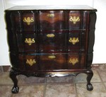 SOUTH AFRICAN STINKWOOD CHIPPENDALE CHEST: Block front 3 drawer chest on carved paw feet, canted corners. 31"h, 31"w. 17"deep. | 250 |