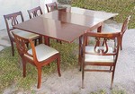 BANDED MAHOGANY DINING TABLE WITH VICTORIAN SIDE CHAIRS: Double pedestal dining table sold with 7 Victorian side chairs. 5 are empire crotch grain side chairs, and 2 are later Victorian with upholstered backs. Table is 82" x 46". | 900 |