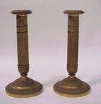GILT METAL EMPIRE CANDLESTANDS, CA 1820: Pair of engine turned candle stick holders. Bronze?, Unmarked, 8"h. | 275 |