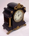 ANSONIA MANTLE CLOCK: Ebonized metal body with gilt metal mountings. Enamel dial marked Ansonia. With key and pendulum, strikes on the hour and half hour. 11" x 11". | 100 |