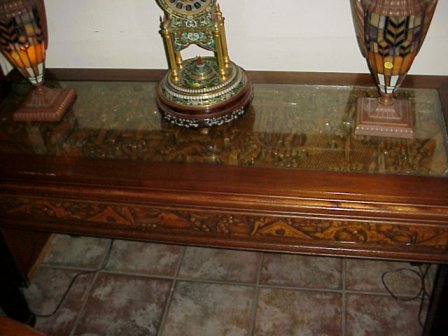 CARVED CHINESE SOFA TABLE: Highly detailed carving under glass, 30"h, 54"w. x 20". | 150 |