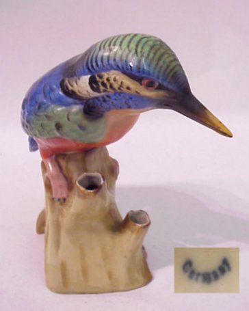 VINTAGE GERMAN PORCELAIN KINGFISHER BIRD FIGURAL FLOWER FROG: Large colorful figure of a Kingfisher flower frog marked Germany. 8 1/4" x 7 1/2". | 100 |