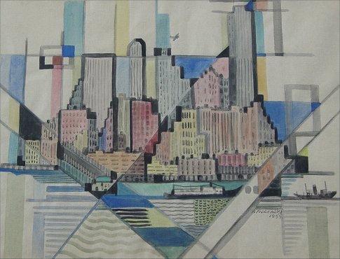 FIORDALISI, Peter, (American, 1904-): New York City skyline, abstract composition, W/C, 17" x 22 1/2", signed lower right, dated 1955. | 150 |