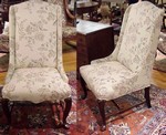 FOUR FRENCH OPEN ARM CHAIRS: Restoration is in order, but we couldn't refuse. Two natural wood, two white wash, though all frames match. | 650 |