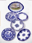 6 PIECE COLLECTION OF FLOW BLUE: Mostly English this fine collection includes a Kyber plate, 9"dia. Manhattan soup bowl, 9" dia, a Meakin Cambridge 10" oval platter, a Doulton Madras plate, 10 1/2" dia., a Woods & Sons Lusitania large bowl, 9 1/2" dia. and a La Francaise platter, 13 1/2"l, with a colorful decal of pheasants. Sold as a lot, no chips or cracks. | 145 |