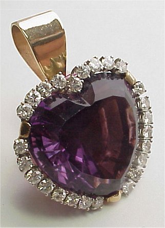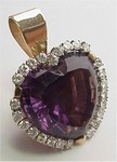 MAJESTIC 25ct RUSSIAN AMETHYST & DIAMOND PENDANT: Dazzling deep purple amethyst cut in a lovely heart shape, approx. 25ct, edged in 25 small round brilliant cut diamonds, approx. 2ctw, set in substantial 14k yellow gold pendant. Just right for an Omega chain or would look nice on a strand of pearls. | 1,500 |