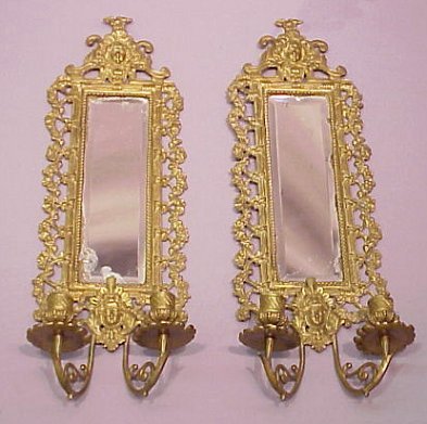 PAIR OF EARLY BRASS MIRROR SCONCES: 2 light candle scones with maiden head masqueron. Original glass, brass back. 21"h. 7"w. | 150 |