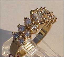 LOVELY LADY'S DIAMOND CHEVRON RING: Centered by a marquise cut, flanked to each side with double rows of round brilliant stones, approx. total weight 80pts, in a raised chevron mounting of 14k yellow gold, size 6. | 250 |