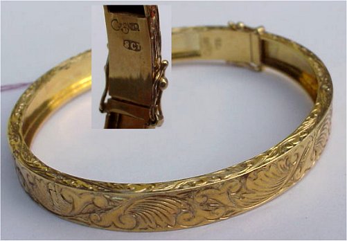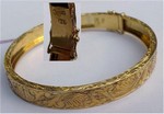 ENGLISH 18K GOLD BANGLE: Deeply etched in a scrolling floral design, marked 18ct and signed Gesner, hinged design with pressure latch and double safety clasps, opening approx. 2 1/2" x 2 1/4". | 325 |