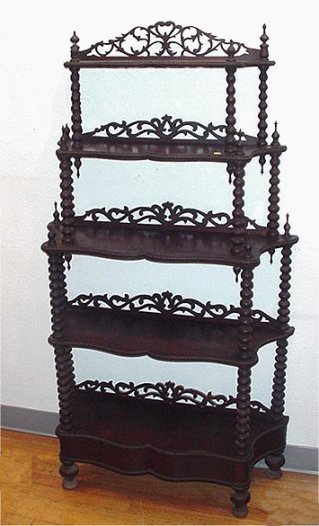 MAHOGANY VICTORIAN 5 TIER ETAGERE: Straight back shelves with pierce carved backs and turned supports. The 5 shelves graduate in size with the longest closest to the bottom being 32"w. One serpentine front drawer across the base, ball feet. 5'h. | 150 |