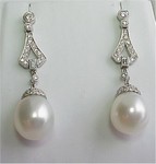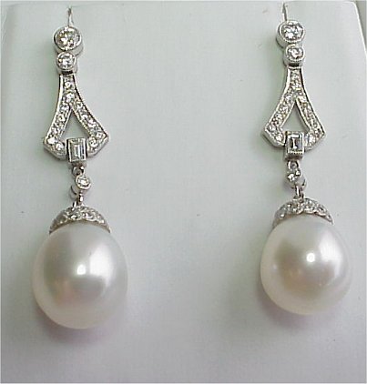 AMAZING SOUTH SEA PEARL, DIAMOND & PLATINUM EARRINGS: A rare and delicate delight, 11.5mm creamy white pearls with pave diamond caps, below assorted bezel and bead set round and emerald cut diamonds, unique pressure backs, approx. 2"l. | 3,800 |