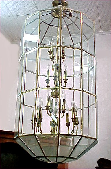 4 FT. BEVELED GLASS AND BRASS CHANDELIER: 20 lights behind panels of beveled glass framed in brass. 4'h. | 250 |