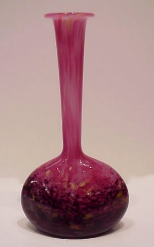 SIGNED SCHNEIDER FRENCH ART GLASS VASE: From the Art deco era. Internally mottled pink, burgundy, and gold glass bottle neck vase. 12 1/2"h. | 275 |