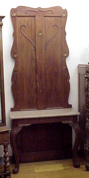 SHAPED OAK HALL RACK: Panel back with shaped edges, five multi hook hanging spots, solid back to floor with marble top hall table on cabriole front legs ending in ball feet, 81" x 33". | 200 |