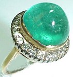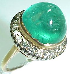 "CREME DE MENTHE" OF A RING: Breath taking 14.28ct cabochon emerald gumdrop bezel set in 14k yellow gold, surrounded by a ring of diamonds, approx. 1ctw, set in white gold and all mounted yellow gold shank. Size 7. | 400 |