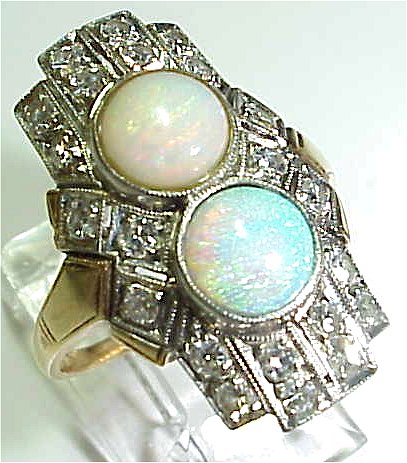 DARLING DIAMOND AND OPAL RING: Platinum setting on 18k yellow gold band. Starring natural cabochon opals of 1ct each, one sparkling with the colors of the sea, the other floating in the clouds of eternity. Framed in bands of diamonds, 3/4ctw, worn makers mark ?PA. Size 6 3/4. | 300 |