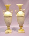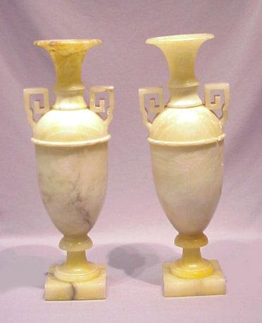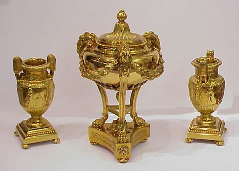 ELEGANT 3 PIECE BRASS GARNITURE: Center covered urn with swags of greenery, drop finial and paw feet, 15"h. Side pieces are embossed with classic figures, each piece with liner. 9"h. | 200 |