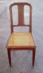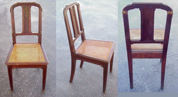 SET OF FOUR 19TH C FRENCH ORMOLU MOUNTED SIDE CHAIRS: Elegantly carved and molded edges to all sides, crest rails, aprons and seats; handwoven cane bottom seats (one repaired), delicate floral ormolu to side rails, back splat and feet. 36"h. Sold as a set. | 150 |