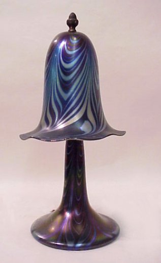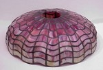 ANTIQUE TIFFANY / HANDEL STYLE GEOMETRIC TABLE LAMP: Ribbon shaped slag glass fragments piece together to form a dome shade having a rippled design, with flower decoration to base. Acorn pulls. Note missing ring cap to shade, possibly scavenged by someone who needed a name for a different lamp. Shade 18"dia., base 21"h. | 450 |