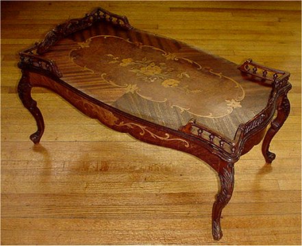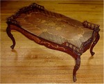 FRENCH MARQUETRY INLAY COFFEE TABLE: Carved gallery, carved cabriole legs. Fitted glass top. 16"h, 35"l. | 150 |
