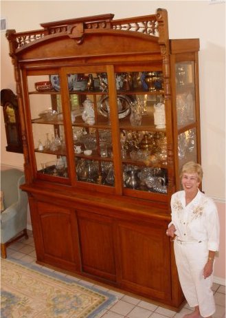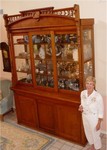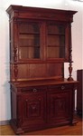 MASSIVE 19TH C WALNUT COUNTRY STORE DISPLAY: Sliding glass doors on the top section, sliding wooden doors on the bottom. Carved Renaissance Revival crest, wooden shelves, probably a store display. 9'5"h, 6'8"wide. | 2,250 |