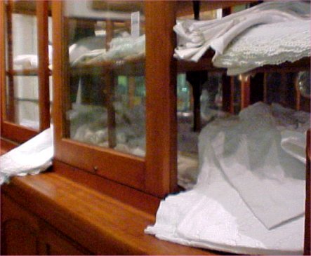 MASSIVE AMOUNTS OF VINTAGE WHITE LINENS IN THE MASSIVE CABINET: At least a dozen table covers PLUS bed covers, sheets and shams, crochet lace with red embroidery, Battenburg galore, Arts and Crafts white on white tablecloths, hand towels, tea towels, and runners. Absolutely all linens in the cabinet. | 600 |