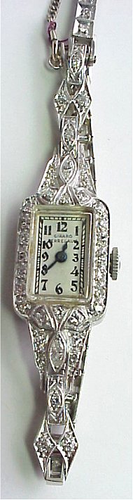 GIRARD PERREGAUX LADY'S DIAMOND WATCH: Platinum case encrusted with diamonds, marquis and round cut; works 17 Jewel Unadjusted Swiss, serial # 52 7 103, dial and works marked Girard Perregaux, inside case marked SM 900 Platinum 100 Iridium, first three links off each side also platinum, back monogrammed HDH; currently on a long 14k white gold bracelet, each link set with its own tiny diamond, double clasp and safety chain. | 525 |