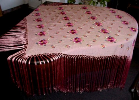 EMBROIDERED VINTAGE PIANO SHAWL: Flowers on rose pink ground. Approx. 45" x 48" plus 18" fringe. Good condition, with no visible holes or rips. | 120 |