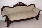 EMPIRE ROCOCO REVIVAL VICTORIAN SOFA: Mahogany framed straight back low lying sofa with applied carving to the top rail. Skirt with wide mahogany band, scrolled feet. 35"l. | 250 |