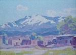 ROLLINS, Warren E., (American, 1861-1962): "Sante Fe, New Mexico", creek side landscape with pueblo architecture and mountains in the distance, O/C, 11" x 15 1/4", signed lower right, signed and titled verso. Condition - Craquelier in sky, needs cleaning, has been re-stretched. Outstanding provenance - Former property of the granddaughter of Sgt George Armijo, interpreter in Teddy Roosevelt's Rough Riders. Teddy Roosevelt was godfather to Sgt Armijo's son, the current owners father. | 2,500 |